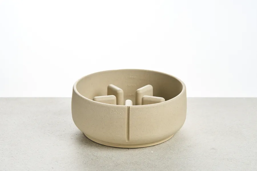 Anti-gulping bowl designed to improve digestion and encourage a calmer eating routine in dogs who tend to eat too quickly. Its inner structure works as a slow feeder, helping reduce overeating, gas and stomach discomfort. It is handmade in Belgium using Pino Sandstone®, a material composed of natural sand, mineral pigments and a structural component that provides strength and stability. Each bowl features small variations that reflect its artisanal process. It is odor-free and does not absorb smells, making it ideal for dogs with a sensitive nose. It is also dishwasher-safe at 30°C on the top rack and can be stored in the fridge to keep food fresh. Includes measurement markers to easily control food portions and maintain balanced servings. The material is non-toxic and hypoallergenic, free from BPA, phthalates, PVC and lead. Available in three sizes, perfect for kibble, wet food, BARF diets or homemade recipes.