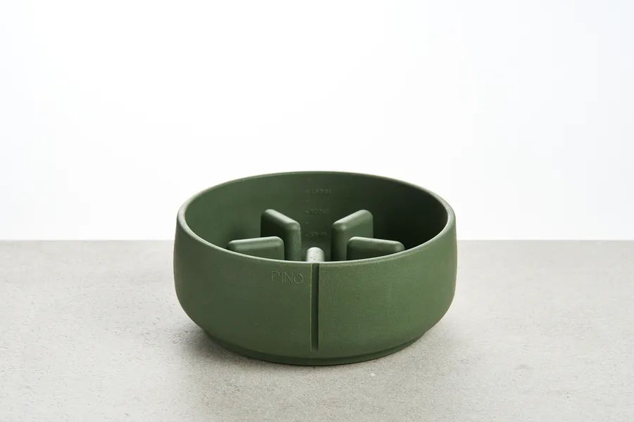 Anti-gulping bowl designed to improve digestion and encourage a calmer eating routine in dogs who tend to eat too quickly. Its inner structure works as a slow feeder, helping reduce overeating, gas and stomach discomfort. It is handmade in Belgium using Pino Sandstone®, a material composed of natural sand, mineral pigments and a structural component that provides strength and stability. Each bowl features small variations that reflect its artisanal process. It is odor-free and does not absorb smells, making it ideal for dogs with a sensitive nose. It is also dishwasher-safe at 30°C on the top rack and can be stored in the fridge to keep food fresh. Includes measurement markers to easily control food portions and maintain balanced servings. The material is non-toxic and hypoallergenic, free from BPA, phthalates, PVC and lead. Available in three sizes, perfect for kibble, wet food, BARF diets or homemade recipes.