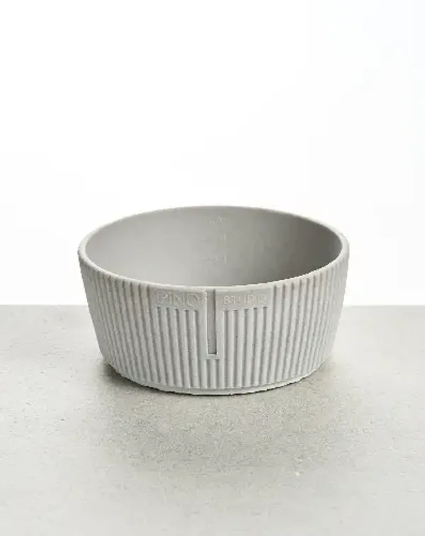 Comedero para perro artesanal y sostenible Pino Studio tamaño M en color gris claro, con textura acanalada vertical y acabado moderno.