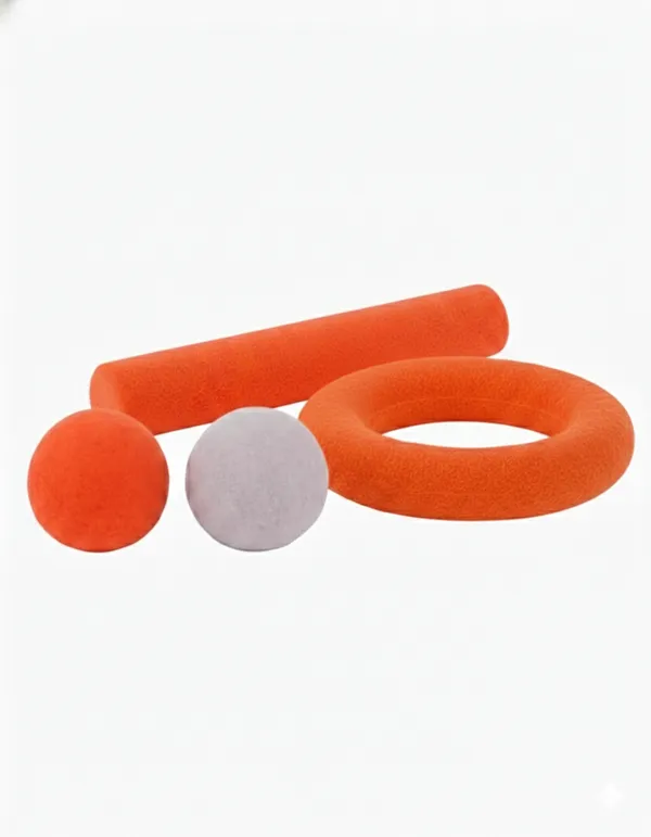Pack de juguetes sostenibles para perros con aro naranja, cilindro y pelotas resistentes.