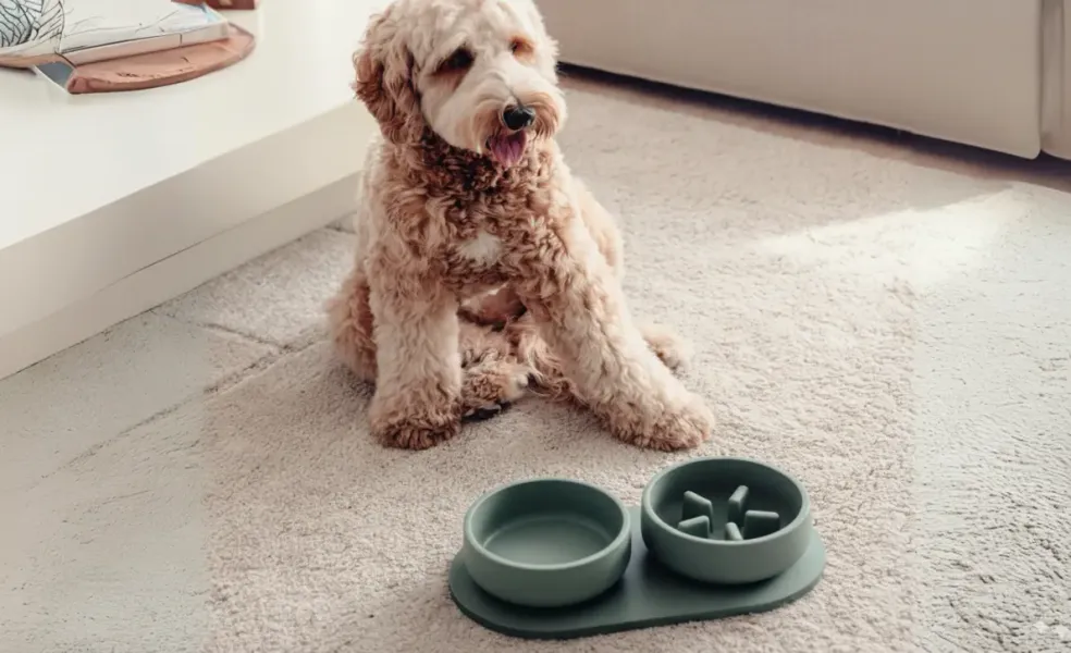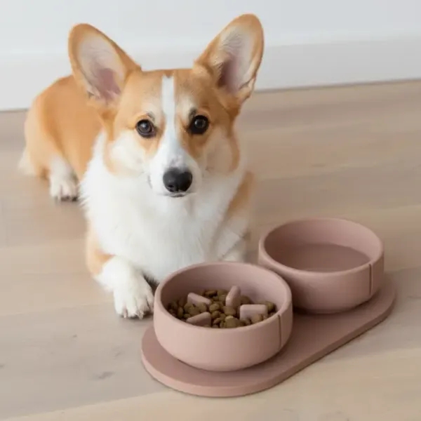 Perro corgi de tamaño mediano junto a un comedero doble rosa terracota con cuenco antivoracidad